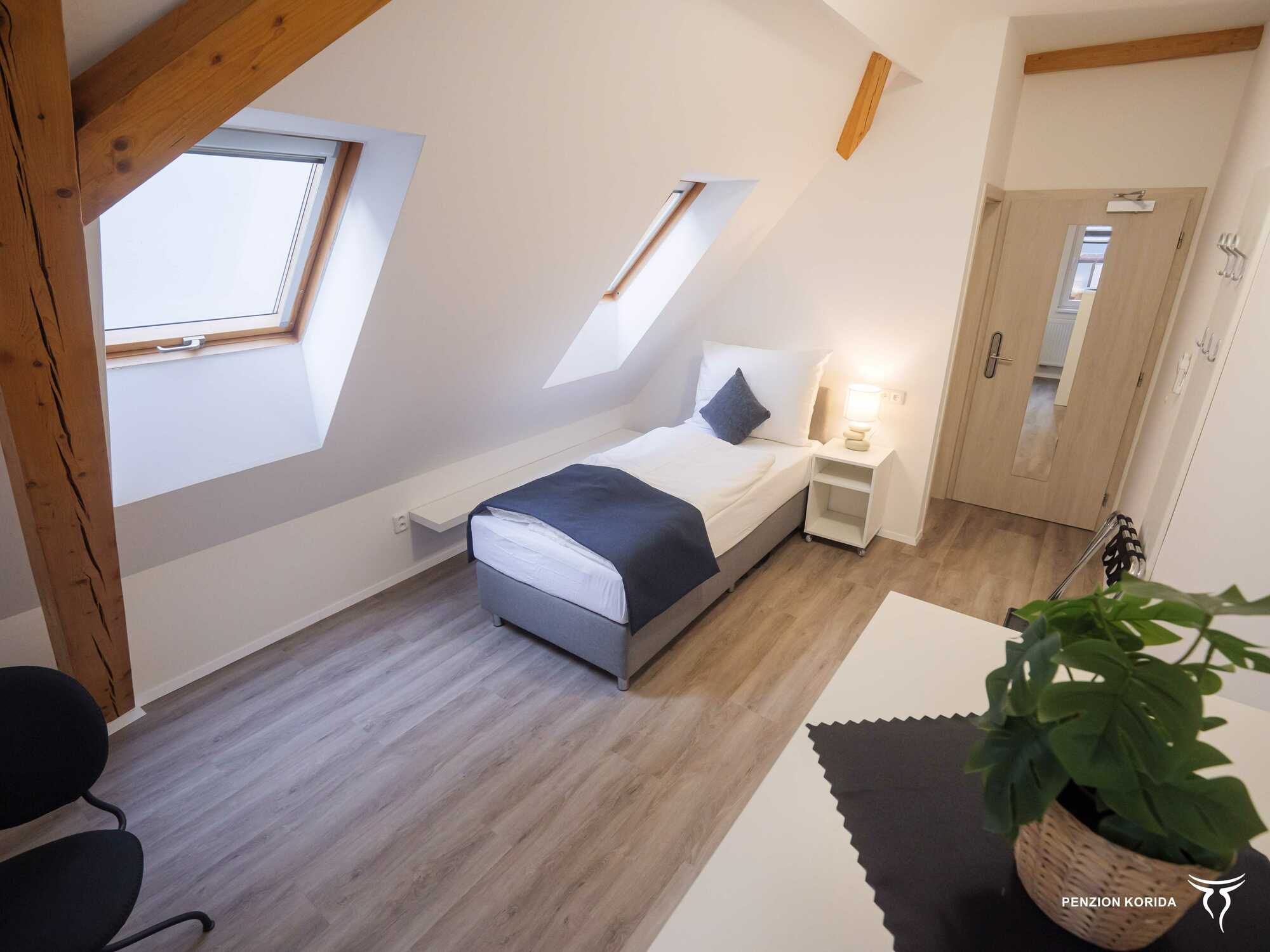 Komfortní klimatizovaný podkrovní jednolůžkový pokoj s pohodlnou postelí. K pokoji náleží vlastní vybavená koupelna se sprchovým koutem a toaletou. V ceně ubytování je k dispozici na pokoji čajový/kávový balíček a jemně perlivá voda. K přípravě lze využít sdílenou kuchyňku.