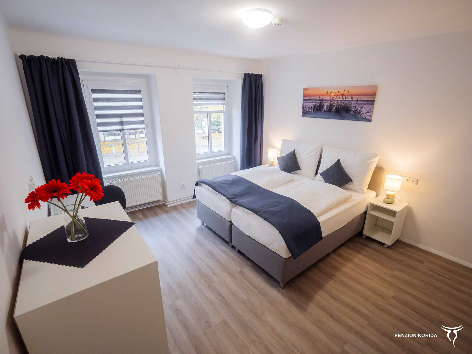 A cosy double room with a comfortabledouble bed, which can alternatively be separated into two single beds. The roomcomes with a fully-equipped bathroom with a shower booth and a toilet. Theprice includes a tea/coffee package and softly sparkling water. You can use theshared kitchen to prepare them.